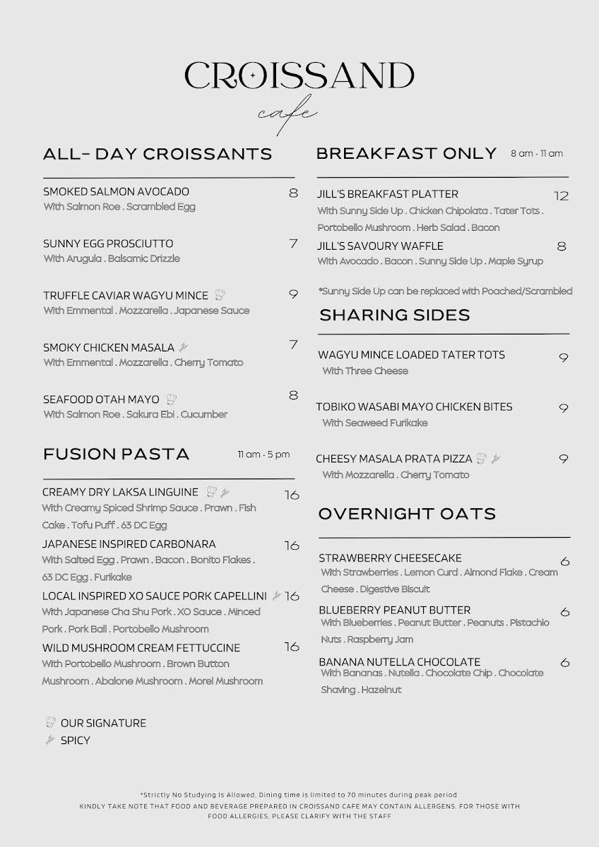 Specializing in an array of mouth-watering croissants, Croissand Cafe takes comfort food to new heights. Each pastry is a delightful blend of buttery layers, achieving that perfect flakiness that croissant lovers crave. Diners rave about the seafood otah mayo and the truffle caviar wagyu croissant, both praised for their exquisite flavors and delightful textures. For those looking to indulge their taste buds further, the chili crab sweet potato fries and do chili pasta standout as favorites, offering a unique twist that visitors can't seem to get enough of.